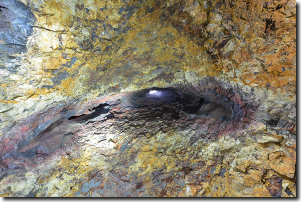 Abb. 6: In der Magmakammer des Thrihnukagigur. Eine einzigartige Perspektive: „Inside the volcano“. Die farbenprächtige, bis zu 120 m hohe Kaverne wird längs von einer basaltisch (grau) verfüllten Spalte durchzogen; in der Mitte am Top die kleine, etwa 4 x 4 m große Öffnung. Der Dreigipfelkrater liegt etwa 20 km südöstlich Reykjavik. Foto: Stefan Drüeke (2014, freundliche Zurverfügungstellung).