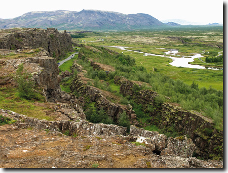 Die spektakulären Dehnungsstrukturen im Thingvellir-Graben (Abb. 6, Z-12 bis Z-14) – dort liegt die altisländische Thingstätte (dt.: Ebene der Vollversammlung), von 930 bis 1789 „Hauptstadt und Regierungssitz“ Islands, mit der bedeutenden Almannagjá (dt.: Allmännerschlucht) – werden als Abschiebungen in Folge von Krustendehnung und nicht (mehr) als Folge von Spaltenintrusionen und Lavaeffusion gedeutet (Einarsson 2008).