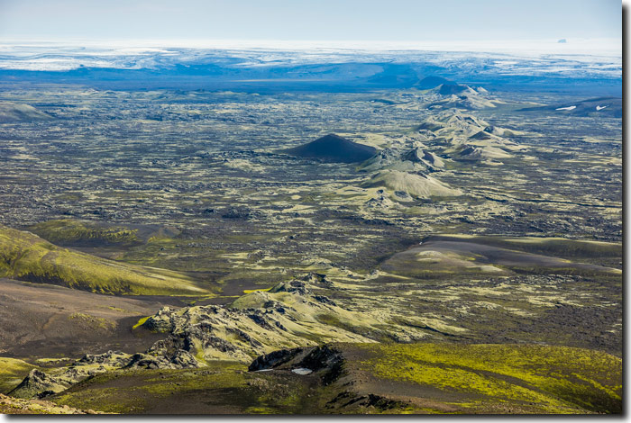 Abb. 8: Laki-Krater. Während der Spalteneruption 1873-74 entstandene Krater-Reihe in strenger SW-NO-Ausrichtung. 15 km3 Lava verteilte sich auf einer Fläche von 600 km2. Die Gasexhalationen führten in Island und Westeuropa zu langanhaltenden Säureniederschlägen und in der Folge zu einer erhöhten Sterberate. Östliche Vulkanische Zone, etwa 15 km bis zum Vatnajökull-Gletscher. Foto: Janos Rajki, 25. 7. 2013, Aufnahme etwa von der Mitte der Reihe Richtung NO (freundliche Zurverfügungstellung).