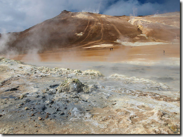 Abb. 9: Solfatarenfeld Hverir. Das Hochtemperaturgebiet mit heißen Quellen, kochenden Schlammtöpfen und Gasausströmungen gehört zum Krafla-Vulkansystem. Nördliche Vulkanische Zone, 5 km östlich des Myvatn (dt.: Mückensee). Foto: M. Kotulla (9. 8. 2014), im Hintergrund der Námafjall (dt.: Minenberg).