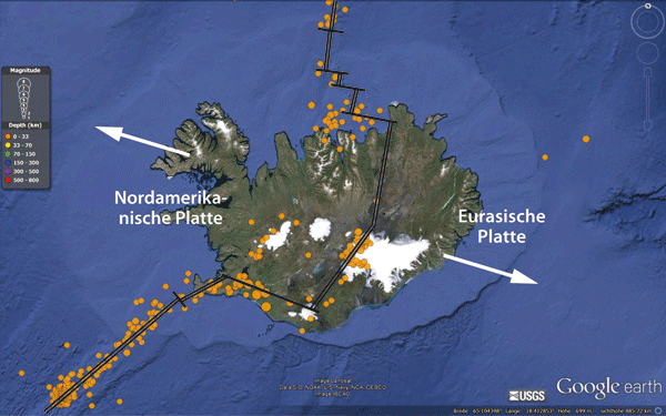 Abb. 10: Definition der nordamerikanisch-eurasischen Plattengrenze. Die Karte weist alle Erdbeben der Magnitude 4 und größer für den Zeitraum 1984-2013 aus. Die mittelatlantische Plattengrenze wird durch den „linienhaften“ Verlauf der Epizentren der Erdbeben definiert. Der USGS legt (schematisch) eine enge Grenzzone über Island, der Grenzbereich hat allerdings eine Ausdehnung von bis zu 150 km (vgl. Textteil und Abb. 3). Der Scheitelgraben des mittelatlantischen Rückens hat in Island über eine Ausdehnung von etwa 350 km seinen einzigen festländischen Anteil; es schließen im SW der Reykjanes-Rücken, im N der Kolbeinsey-Rücken, an. Bild: Google Earth, Bildbreite etwa 1.050 km; Daten und Grenzziehung: USGS (earthquake.usgs.gov), geologischer Dienst der USA; Grenze nachgebildet durch den Verfasser (einfache Linie: Transformstörung; doppelte Linie: divergierende Plattengrenze).