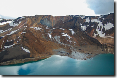 Abb. 11: Bergsturz vom 21. 7. 2014 in den Caldera-See der Askja. Breite der Abbruchkrone etwa 800 m. Ein Teil der schätzungsweise 30-50 Millionen m3 Schuttmassen gelangte in den See und löste eine 20-30 m hohe Flutwelle aus. Foto: Sveinn Brynjolfsson, IMO*, http://en.vedur.is/avalanches/articles/nr/2929 (freundliche Zurverfügungstellung).