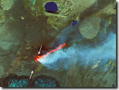 Abb. 12: Spalteneruption im Holuhraun-Gebiet. Der Ausbruch begann am 29. August 2014; nach 8 Tagen erreichte der Lavastrom eine Länge von etwa 10 km. Der Lavaaustritt folgt streng einer N-NO-orientierten Linie (weiße Pfeile, kleinerer Ausbruchspunkt unterhalb), eine Ausrichtung die für die Nördliche Vulkanische Zone typisch ist. Oben (N) der Zentralvulkan Askja mit dem Calderasee Öskjuvatn, unten (S) die nördlichen Ausläufer des Vatnajökull-Eisschildes; Bildbreite: 36 km. LANDSAT 8-Falschfarbenaufnahme, Foto/Credit: NASA (5. September 2014).