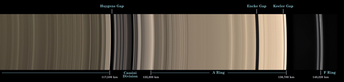 Die hochauflösenden Bilder von Cassini zeigen sehr eindrucksvoll, wie fein strukturiert das Ringsystem ist (Abb. 2). Wie werden solche Strukturen erklärt und wie lange können sie bestehen, ohne verschmiert zu werden? Es handelt sich genau genommen nicht um separate Unterringe, sondern vielmehr um Dichtevariationen. In Wirklichkeit sind die dunklen Teile zwischen den Unterringen nicht leer, sondern enthalten lediglich weniger Material als die direkte Umgebung. Diese Feinstruktur lässt sich sehr zufriedenstellend durch Resonanzen erklären, die durch die kleinen Monde hervorgerufen werden. Dabei spielt insbesondere der Mond Mimas eine Rolle, weil er sich sehr nah am Ringsystem befindet. Solange diese Monde ihre Bahnen ziehen, bleibt auch die Feinstruktur der Ringe erhalten. Ohne die Monde würden sich diese Dichtevariationen in sehr kurzer Zeit (weniger als 1 Monat) verschmieren. Obwohl also die Feinstruktur an sich nur sehr kurzlebig ist, stellt sie kein Argument gegen ein hohes Alter der Ringe oder der Ringstruktur dar, weil die Struktur aktiv durch die Monde von Saturn aufrechterhalten wird.