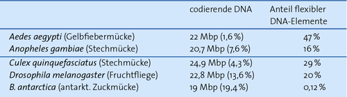 Tab. 1: Absolute Größe der codierenden DNA und ihr relativer Anteil am Gesamtgenom sowie die Anteile flexibler DNA-Elemente bei einigen Mückenarten. (Nach Kelley et al. 2014)