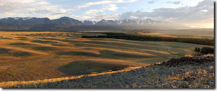 Abb. 1: Gigantische Strömungsrippeln im Kuraj-Becken, Altai-Gebirge, Südsibirien. Die Strukturen in einer Meereshöhe von über 1500 m, 2500 km vom nächsten Meer entfernt, entstanden bei einer durch einen Eisstausee-Ausbruch verursachten Megaflut. Sie haben eine Wellenlänge zwischen 50 und 100 Meter und erreichen eine Höhe bis 16 Meter. Foto: Alexei Rudoy (freundl. Überlassung).