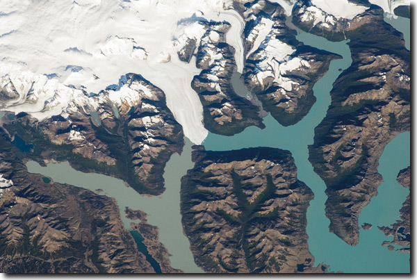Abb. 2: Gletscherdamm, Patagonien. Die Gletscherzunge des 30 km langen Perito-Moreno-Talgletschers (Bildmitte) staut den südlichen Teil des Argentino-Sees (Brazo Rico, links, schlammfarben) relativ um bis zu 30 m auf. Übersteigt der Druck des aufgestauten Schmelz-wassers einen Schwellenwert, bricht der natürliche Eisdamm. Gegenwärtig geschieht dies alle vier bis fünf Jahre. – Ein natürliches Miniatur-Labor im Vergleich zur Lake-Missoula-Flut mit einem etwa 700 Meter hohen Eisdamm. Foto (Credit): NASA (ISS030-E-91253) vom 21. Februar 2012 (letzter Dammbruch im März 2012), Norden ist rechts, Bildbreite etwa 57 km.