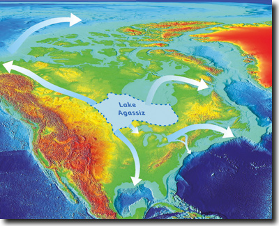 Abb. 3: Der Glazialsee Lake Agassiz (Nordamerika) mit den Drainage-Routen zu den Rand- und Weltmeeren (zur Verdeutlichung ohne Laurentidischen Eisschild). In seinem Endstadium bedeckte der gigantische See nach Modellrechnungen mit einem Volumen von 163.000 km3 eine Fläche von etwa 841.000 km2. Das Volumen entspricht dem Doppelten des heutigen Kaspischen Meeres. Die Megaflut soll 6 Monate angedauert haben. Grafik: John Shaw & Michael Lewis (freundl. Überlassung).