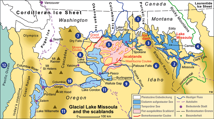 Abb. 4: Vereinfachte Karte zur Lake-Missoula-Flut. Grafik: Tony Waltham (freundl. Überlassung), aus Geology Today (2010, s. Literatur); Nummern ergänzt durch den Verfasser. Weiß: Kordillerische Eisdecke; Blau: aufgestauter Missoula-See; hellblau: temporäre (Tage-) Seen; rosa: tiefgreifend erodierter Bereich (Scabland).