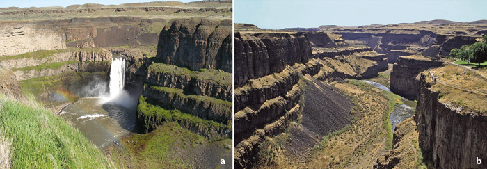 Abb. 6: a Palouse Falls. Der heutige Palouse River kann weder den gigantischen Strudelkessel noch den Katarakt noch den Canyon geschaffen haben. Die Besichtigung dieser Lokalität durch Geologen der Quartärvereinigung führte 1965 final zur Akzeptanz der von Bretz seit über 40 Jahren vertretenen, katastrophischen Fluthypothese. Lokalität siehe Abb. 4, Nr. 6. Foto: PJ Blalock (Wikimedia Commons)