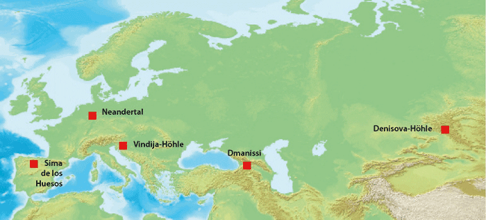 Abb. 1: Geographische Lage der wichtigsten im Text angesprochenen Fundstellen von homininen Fossilien. Neandertal (bei Düsseldorf; Fundstelle des Neandertaler-Typusexemplars), Vindija-Höhle in Kroatien, Denisova-Höhle im Altai Gebirge (Sibirien, Russland), Sima de los Huesos, Höhle in Sierra de Atapuerca (Nordwest Spanien), Dmanissi in Süd- Georgien