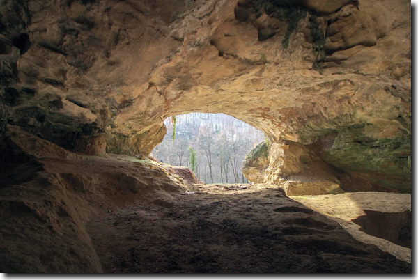 Abb. 2: Blick aus der Vindija-Höhle im Norden Kroatiens. Aus dieser Höhle stammen Fragmente von Neandertalerfossilien, die bei der Gewinnung des Genoms von Neandertalern eine bedeutende Rolle gespielt haben. (Wikipedia, Foto: Tomislav Kranjcic, Creative Commons Attribution-Share Alike 2.0 Generic license)