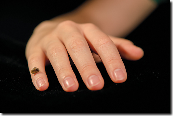 Abb. 3: Fossiles Fingerknöchelchen (Phalanx) des Denisova-Menschen. Aus diesem Fossil konnte DNA isoliert werden, die einen erstaunlich hohen Anteil (ca. 70%) aufwies, der zum ursprünglichen Lebewesen gehört. Von Denisova-Menschen sind bisher nur diese Phalanx und zwei Backenzähne bekannt. Sein Erbgut kennen wir dagegen weitgehend. (Foto: Max-Planck-Institut für Evolutionäre Anthropologie; Abdruck mit freundlicher Genehmigung)