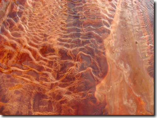 Abb. 1: Bunte Ablagerungen in der Brunnenschale des König-Heinrich-Sprudels in Bad Soden-Salmünster (Hessen). Das hochkonzentrierte Mineralwasser stammt aus einem 540 m tiefen Brunnen, beim Kontakt mit der Luft werden gelöste Metalle oxidiert und gefällt. (Foto: R. Schäffer)