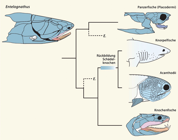 Abb. 1: Modellierung der Evolution des kiefertragenden Gesichts der Wirbeltiere. Die Knochenfische besitzen große Schädelknochen, während die fossilen Acanthodii und Knorpelfische (z. B. Haie) zahlreiche kleine Knochen oder winzige Schuppen tragen. Panzerfische besitzen ebenfalls große Schädelknochen. Die Position von Entelognathus (E.) ist unsicher, da diese fossile Gattung anatomische Merkmale der Knochenfische und Panzerfische besitzt. Entgegen früherer Annahmen lassen sich die Merkmalsverteilungen nun eher so erklären, dass die Knorpelfische abgeleitet und nicht ursprünglich sind. Weiteres im Text. (Nach Friedman & Brazeau 2013 , Abdruck mit freundlicher Genehmigung)