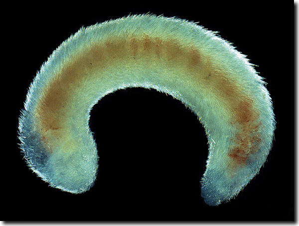 Vor diesem Hintergrund ist es überraschend, dass neuere Befunde immer wieder darauf hindeuten, dass Organismengruppen – soweit sie fossil zurückverfolgt werden können – in komplexer Ausprägung ihren Einstand in der Fossilüberlieferung geben, um anschließend zum Teil erhebliche Rückbildungen zu erleben. Über ein solches Beispiel berichten Andreas Wanninger von der Universität Wien und sein Team (Scherholz et al. 2013). Um die bis heute unklaren Abstammungsverhältnisse der Weichtiere (Mollusken) zu erhellen, untersuchten die Forscher den Entwicklungszyklus der einfach gebauten Art Wirenia argentea (Abb. 1) aus der Weichtiergruppe der Aculifera (Stachelweichtiere). Die Aculifera bilden eine der beiden großen Untergruppen der Mollusken; ihre wurmförmigen oder walzlichen Vertreter haben keine typische Molluskenschale, sondern Kalknadeln oder kalkige Platten auf der Außenhaut. Unter ihnen werden schalenlose Tiere (Aplacophora, Wurmmollusken) und beschalte Formen (Polyplacophora, Käferschnecken) unterschieden. (Die andere Untergruppe sind die Conchifera, primär einschalige Formen, zu denen Schnecken, Muscheln und Tintenfische gehören.)