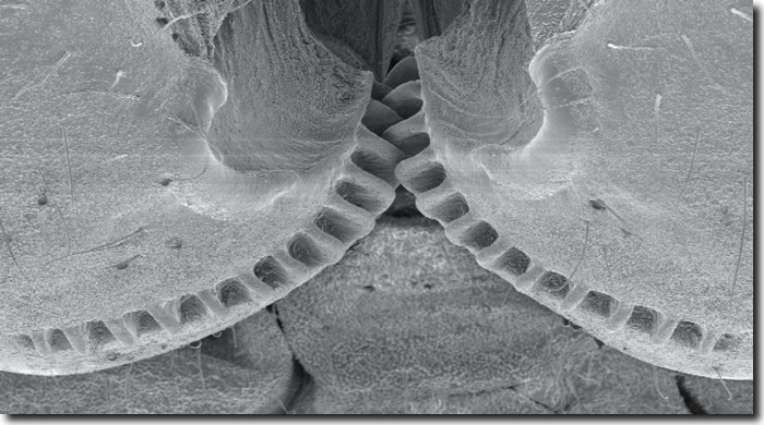Abb. 1: Die Miniatur-Zahnräder der Käferzikaden-Larve Issus coleoptratus. Bildbreite ca. 0,5 mm! (© Burrows & Sutton, University of Cambridge, UK, Abdruck mit freundlicher Genehmigung.)