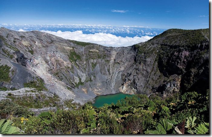 Abb. 1: Krater des Irazú („Grollender Berg“, 3432 m), Costa Rica. Ein Teil der eruptierten Magma der Ausbruchsphase von 1963-65 stammte aus dem Erdmantel in etwa 35 km Tiefe und benötigte lediglich einige Monate bis zur Oberfläche (Foto: Rafael Golan, Wikimedia Commons).