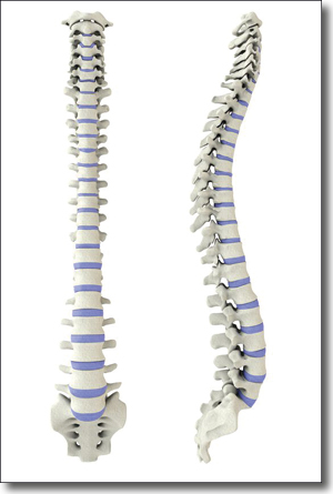 Abb. 1: Die Wirbelsäule ist ein häufig genutztes Beispiel, um evolutionär bedingte Fehlkonstruktionen des menschlichen Körpers zu belegen. Insbesondere Bandscheibenvorfälle im unteren Drittel der Wirbelsäule (Bandscheiben blau markiert) werden als Folge einer inkompletten Anpassung an den aufrechten Gang interpretiert. Diese Einäschätzung wird jedoch nicht von allen Forschern geteilt. Nach jahrzehntelanger Erforschung der Biomechanik des menschlichen Skeletts sagte z. B. Reinhard Putz, Leiter am Anatomischen Institut der Ludwig-Maximilians-Universität in München: Die Wirbelsäule ist ein „Meisterstück“ der Evolution (FAZ vom 5. 4. 2006). (© Fotolia, Robert Kneschke)