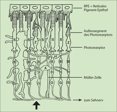 Abb. 3: Schematisches Diagramm der Netzhaut bei Wirbeltieren (Retina). Die Anordnung der Zellschichten in der Netzhaut ist invers, d. h. die lichtempfindlichen Zellen (Zapfen, Stäbchen) liegen auf der dem Licht abgewandten Seite des Zellverbundes. Diese Konstellation wird sehr häufig als Konstruktionsfehler gewertet, obwohl man schon lange weiß, dass diese Anordnung u. a. günstig für den Stoffwechsel der Sinneszellen (das RPE dient der Versorgung der Retinazellen) und ontogenetisch begründet ist. Vor einigen Jahren konnten Forscher die Funktion radial durch die Netzhaut verlaufender Fortsätze von Müller-Zellen klären. Sie fungieren als Lichtleiter, die einen nahezu verlustfreien Transport des Lichts zu den äußeren Segmenten der Sinneszellen garantieren. Darüber hinaus korrigieren sie optisch bedingte Verzerrungen. Die inverse Konstruktion der Netzhaut der Wirbeltiere ist genial und hinsichtlich ihrer Funktion hochgradig optimiert. Der dicke Pfeil zeigt die Richtung des einfallenden Lichts an. A Amakrine Zelle, B Bipolarzelle, G Ganglienzelle, H Horizontalzelle, S Stäbchen, Z Zapfen. (Nach Adler & Farber 1986 und ergänzt nach Franze et al. 2007)