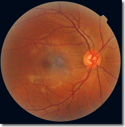 Abb. 4: Paradebeispiel für einen vermeintlichen Konstruktionsfehler: Die als „blinder Fleck“ bezeichnete Sehnervenpapille der Netzhaut im Augenhintergrund des menschlichen Auges (heller Bereich). Dort laufen zahlreiche Nervenfortsätze (ca. 1 Million) zusammen und verlassen das Auge als Sehnerv Richtung Gehirn. An dieser Stelle ist das Auge „blind“. (Bild: Wikipedia)