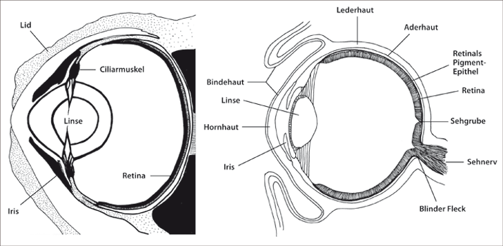 Abb. 5: Vergleich von Tintenfischauge und Wirbeltierauge. Links: Querschnitt durch ein Tintenfischauge (nach Budelmann 1994); rechts: Querschnitt durch ein Wirbeltierauge (nach Adler & Farber 1986).