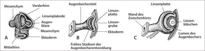 Abb. 6: Embryonalentwicklung der Augenanlage beim Menschen. A Vorderhirn mit umgebendem Mesenchym und Ektoderm bei einem 28 Tage alten Embryo. B Frühes Stadium der Augenbecherentwicklung (ca. 30. Tag), Induktion der Linsenplakode. C Augenbecher und Linsenbläschenbildung sowie Anlage der Retina (ca. 35. Tag). (Nach Moore 1990)