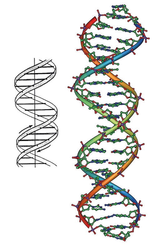 Abb. 1: Rechts: Ein Modell der DNA-Doppelhelix (Wikimedia Commons); links die historische Darstellung aus der Veröffentlichung von Watson & Crick (1953). Die Helix ist 2 nm breit und eine Umdrehung 3,4 nm lang. (1 nm = 1 Millionstel Millimeter)