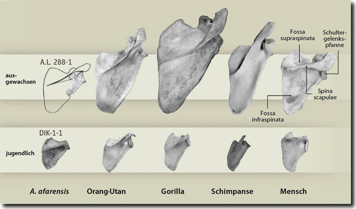 Abb. 1: Das Schulterblatt der Großaffen, des Menschen und von Australopithecus afarensis im Kindheits- und Erwachsenenalter. Die nach unten ausgerichtete Schultergelenkspfanne und die mehr horizontale Spina scapulae des juvenilen (jugendlichen) Menschen stehen im Gegensatz zur nach oben ausgerichteten Schultergelenkspfanne und schrägen Spina scapulae der juvenilen Großaffen und des juvenilen Australopithecus afarensis. Bei den adulten (ausgewachsenen) Großaffen und Australopithecus afarensis ist weiterhin die Schultergelenkspfanne nach oben ausgerichtet und die Spina scapulae verläuft schräg, beim adulten Menschen ist gegenüber dem juvenilen Menschen die Schultergelenkspfanne mehr nach außen ausgerichtet und die Spina scapulae verläuft noch stärker horizontal. Die Rekonstruktion des adulten Schulterblattes von Australopithecus afarensis basiert auf AL 288-1 und Merkmalen von DIK-1-1. Die adulten Schulterblätter sind angenähert maßstabsgetreu. (Aus Larson 2012)