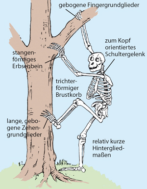 Abb. 2: Mögliche Fortbewegung bei Australopithecus afarensis: Stemmgreifklettern, Watschelgang und charakteristische morphologische Merkmale. (Nach Fleagle 1988)