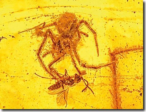Es gibt bereits viele Beschreibungen von Spinnen in fossilem Harz (Wunderlich 2004). Nun wurde in einem Bernstein (ca. 12 x 5,4 x 3 mm) aus einer Mine in Myanmar (Birma bzw. Burma) eine Jagdszene von Spinnen mit einer Wespe als Beute beschrieben (Poinar & Buckley 2012). Geologisch wird das Vorkommen dieser Mine der Unteren Kreide (Oberes Albian) zugeordnet; dies entspricht einem datierten Alter von 97-110 Millionen Jahren.