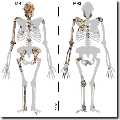 Abb. 1: Zwei Teilskelette von Australopithecus sediba (MH1 jugendliches Individuum und MH2 erwachsenes Individuum) in etwa anatomisch regelrechter Position. Der rechte obere Teil des Schienbeines von MH1 ist auf der Grundlage eines natürlichen Abgusses der oberen Metaphyse rekonstruiert worden. Die Metaphyse ist der Abschnitt eines Röhrenknochens, welcher zwischen dem Schaft des Knochens (Diaphyse) und der Epiphyse liegt. (Aus Berger et al. 2010)