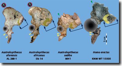 Abb. 2: Hüftknochen früher Homininen von außen gesehen. Alle Beckenknochen sind so ausgerichtet, dass die Darmbeinschaufeln in der Abbildungsebene (Ebene der Fotografie) liegen. Australopithecus sediba (MH1, zusammengesetzt) besitzt einige menschenähnliche bzw. intermediär zwischen Australopithecus und Homo stehende Merkmale. Dazu gehören (1) ein verringerter Abstand zwischen Kreuzbein-Darmbein-Gelenk (gelbe Fläche) und Hüftgelenk (Kreisfläche), (2) ein vergrößertes Gebiet des Darmbeines hinter der Gelenkfläche für das Kreuzbein (blaue Pfeile), (3) eine gut entwickelte Knochenstrebe zwischen der Hüftgelenkspfanne und dem Darmbeinkamm (grüne Pfeile) und zwischen der Hüftgelenkspfanne und dem Kreuzbein und (4) eine enge Rinne zwischen dem Sitzbeinhöcker und der Hüftgelenkspfanne (gelbe Pfeile). (Aus Berger et al. 2010). Nach Reed & Churchill (2012) ist (3) bei Australopithecus sediba nicht stärker als bei den anderen Australopithecinen entwickelt.
