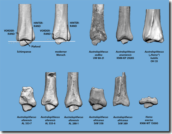 • Der die Gelenkfläche tragende Knochen der distalen Tibia erstreckt sich deutlich nach posterior und lateral wie bei Homininen. • In der sagittalen Ebene stellt sich der hintere Rand des Oberdaches der distalen Tibiagelenkfläche (Plafond) mehr posterior gegenüber dem vorderen Rand dar (Abb. 4). • Die Metaphyse (Abb. 5) ist anteroposterior in Relation zur anteroposterioren Gelenkfläche erweitert wie bei den Homininen. • In der coronalen Ebene ist die distale Tibiagelenkfläche (Plafond) senkrecht zur langen Tibia-Schaftachse wie beim modernen Menschen und anderen fossilen Homininen ausgerichtet (Abb. 6). • Die Gelenkfläche für den Talus ist von lateral gesehen stark gekrümmt (Abb. 4) und von distal gesehen leicht keilförmig. Bei den Großaffen ist diese Gelenkfläche oft flach und trapezoid geformt (Abb.7). • Der Malleolus medialis ist extrem robust und damit unähnlich dem mehr grazilen Malleolus medialis des modernen Menschen und der anderen fossilen Homininen (Abb. 4, 5 und 7).