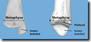 Abb. 5: Ansicht der unteren Metaphyse des Schienbeines in zwei Ebenen. Die Metaphyse ist der nicht scharf abgrenzbare epiphysennahe Abschnitt der Diaphyse langer Röhrenknochen. (Nach Zipfel et al. 2011)