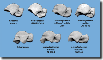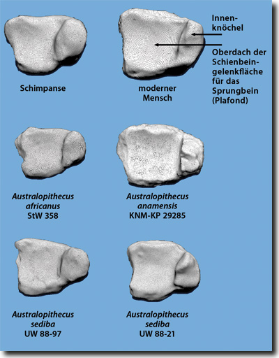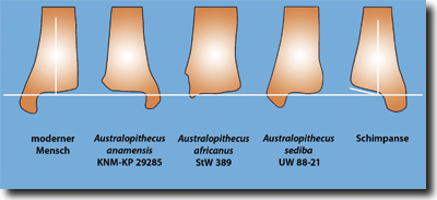 Abb. 6: Ansicht des unteren Endes des Schienbeines vom modernen Menschen, Schimpansen und fossiler Homininen. Das Oberdach der unteren Gelenkfläche des Schienbeines (Plafond) ist beim modernen Menschen und den fossilen Homininen senkrecht, beim Schimpansen dagegen schräg zur langen Achse des Schienbeines ausgerichtet. (UW 88-21 nach Zipfel et al. 2011, die anderen Abbildungen nach DeSilva & Throckmorton 2010)