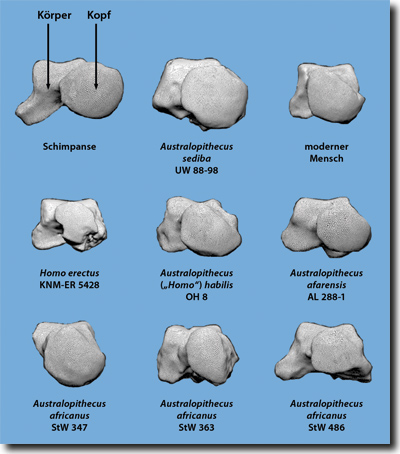 Abb. 9: Ansicht des Sprungbeines vom modernen Menschen, Schimpansen und fossilen Homininen von vorn. Alle Sprungbeine sind in der Größe so dargestellt, dass der Körper in der seitlichen Ausdehnung gleich groß ist. Einige Sprungbeine sind gespiegelt. Der große Kopf des Sprungbeines von Australopithecus sediba weist auf eine hohe Beweglichkeit im Sprungbein-Kahnbein-Gelenk hin. (Aus Zipfel et al. 2011)