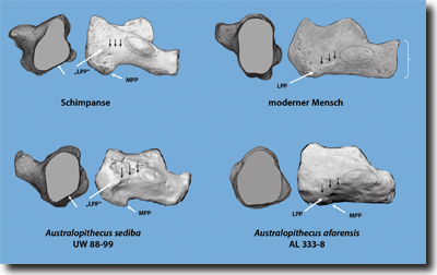 Abb. 10: Rechtes Fersenbein vom Schimpansen, modernen Menschen und fossilen Homininen. Der moderne Mensch besitzt eine schräg ausgerichtete retrotrochleare Erhebung (schwarze Pfeile) hinter der Trochlea peronealis (gestrichelte Umkreisung) und einen fußsohlenwärts gelegenen lateralen Processus plantaris (LPP). Ein medialer Processus plantaris (MPP) ist an der Fußsohle oft nicht sichtbar. Dieses morphologische Muster findet sich ähnlich auch bei Australopithecus afarensis. Dagegen findet sich bei Australopithecus sediba eine retrotrochleare Eminenz und ein weiter oben gelegener, nicht gewichtstragender Knochenfortsatz („LPP“) wie bei den Großaffen. Der Fersenhöcker von Australopithecus sediba ist durch eine Abschrägung der unteren äußeren Region (Pfeil) im Gegensatz zum modernen Menschen und anderen fossilen Homininen nicht robust wie bei den Großaffen. Bei Australopithecus sediba findet sich eine menschenähnlich abgewinkelte Gelenkfläche für das Würfelbein (Klammer) auf dem Fersenbein. (Aus Zipfel et al. 2011)