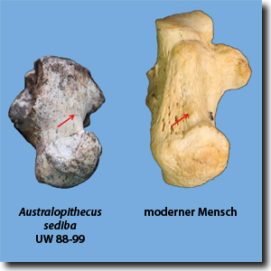 Abb. 11: Ansicht des Fersenbeines von unten von Australopithecus sediba und vom modernen Menschen. Der Pfeil weist auf einen kleinen Höcker bei Au. sediba und dem Menschen hin. Dieser kleine Höcker ist bei den afrikanischen Großaffen nicht nachweisbar. Beim Menschen dient dieser Höcker als Ansatz des langen Sohlenbandes. (Aus Zipfel et al. 2011)
