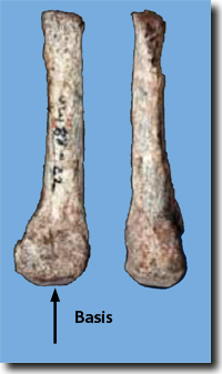 Abb. 12: Rechter vierter Mittelfußknochen von Australopithecus sediba (UW 88-22) von innen (links) und von hinten (rechts) gesehen. Die Basis des vierten Mittelfußknochens (Pfeil) ist leicht konvex geformt. Beim Menschen und bei den anderen fossilen Homininen ist dies nicht der Fall. (Aus Zipfel et al. 2011)