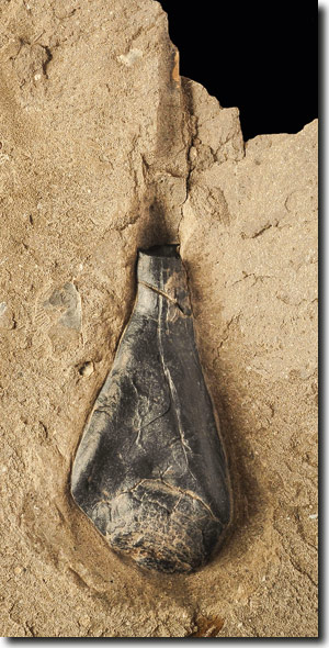 Abb. 2: Fossiler Tintenbeutel mit Abdrücken von Blutgefäßen der umhüllenden muskulösen Tasche. (© Philip R. Wilby, BGS NERC)