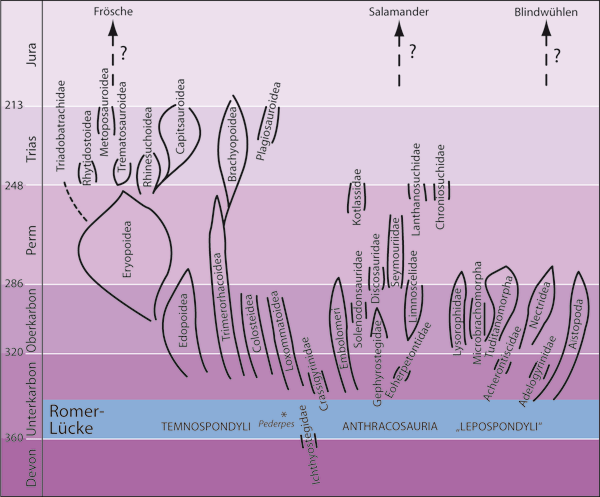 Abb. 1: Überblick über die stratigraphischen Positionen der paläozoischen Tetrapoden nach Carroll (1993). Die Romer-Lücke ist farblich hervorgehoben. Die Verwandtschaftsverhältnisse können kaum bestimmt werden. Die nun in der Romer-Lücke entdeckten Fossilien können weitgehend späteren Familien zugeordnet werden.