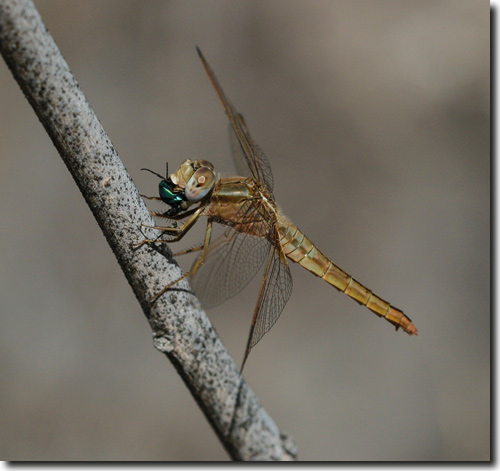 Abb. 1: Weibchen der Feuerlibelle (Crocothemis erythraea) beim Fressen. (Creative Commons Lizenz, © Sandy Rae)