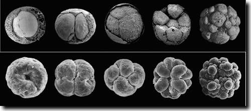 Abb. 1: Obere Reihe: Verschiedene embryonenähnliche Fossilien aus der südchinesischen Doushantuo-Formation, die nach Ansicht von Huldtgren et al. (2012) fehlinterpretiert wurden (zur Begründung siehe Text). In der unteren Reihe sind verschiedene Entwicklungsstadien der Grünalge Volvox carteri f. nagariensis abgebildet, die gewisse Ahnlichkeiten mit den vermeintlichen Embryonen zeigen. (Aus Huldtgren et al. 2012)