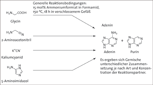 Ein kürzlich veröffentlichter Artikel zu dieser Fragestellung stammt von der Forschergruppe um Krishnamurthy (2012). Darin wird die Synthese von Purin bzw. Adenin durch Erhitzen von Kaliumcyanid oder einfacher Moleküle wie Glycin, 2-Aminoacetonitril bzw. 5-Aminoimidazol in einer hoch konzentrierten Lösung von Ammoniumformiat in reinem Formamid auf 150 °C beschrieben (siehe Abb. 1). Zur Stützung der Plausibilität dieses Reaktionswegs werden hauptsächlich zwei Argumente angeführt: Zum einen sei eine Anreicherung des Formamids aufgrund des im Vergleich zum Wasser geringeren Dampfdrucks wahrscheinlicher als diejenige von Blausäure, die in früheren experimentellen Arbeiten als Ausgangsstoff angenommen wurde (Oró 1960). Zum anderen wird die Ähnlichkeit des Reaktionsverlaufs zur Biosynthese des Adenins angeführt. Solche Ähnlichkeiten könnten nach Ansicht der Autoren bei der Aufklärung der Evolution früher, für den Stoffwechsel von Lebewesen relevanter Reaktionskaskaden hilfreich sein.