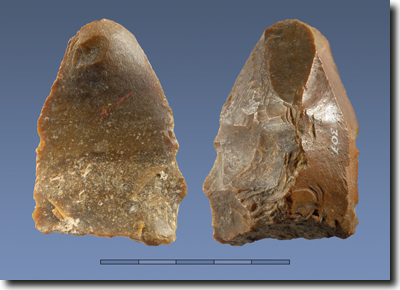 Abb. 2: Spitzschaber aus einem Abschlag mit sehr feinen Kantenretuschen. Sammlung M. Verworn, Seminar für Ur- und Frühgeschichte und Vorderasiatische Archäologie, Ruprecht-Karls-Universität Heidelberg. (Aus Brandt 2011, 375)