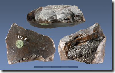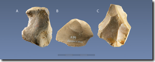 Abb. 3: A Hohlschaber mit feiner Retusche, B Abschlag mit großer Schlagnarbe, C Kern mit mehreren Abschlagnegativen und feinen Aussplitterungen. Alle Bilder Sammlung M. Verworn, Seminar für Ur- und Frühgeschichte und Vorder-asiatische Archäologie, Ruprecht-Karls-Universität Heidelberg. (Aus Brandt 2011, 173,f.)