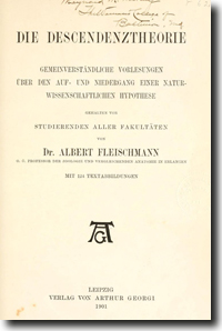 „Die Descendenztheorie“, ein außergewöhnliches Buch: In vielerlei Hinsicht auch über 100 Jahre später noch aktuell, fachlich in der Begründung, eindrücklich in der Beschreibung des Zeitgeistes und der Methoden der Meinungsbildung. Es wäre sicherlich im Sinne Professor Fleischmanns, wenn sich der Leser selbst ein Urteil bildet. Das Buch kann online gelesen werden: http://archive.org/stream/diedescendenzthe00flei#page/n3/mode/2up