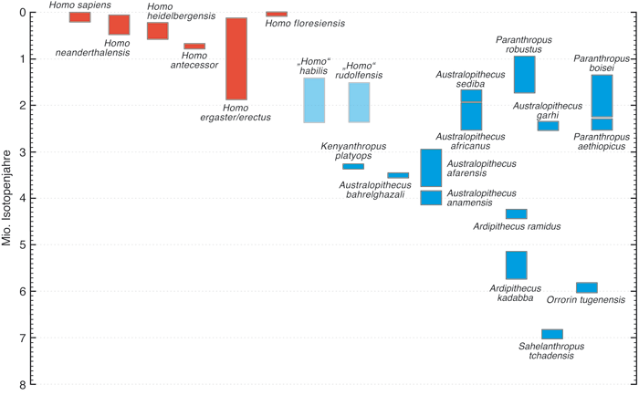 Abb. 1: Die fossilen Homininen-Arten und ihr zeitliches Auftreten. Nach Wood & Baker (2011), geringfügig verändert.