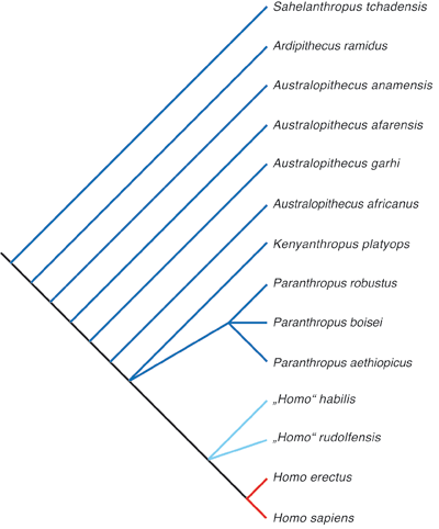 Abb. 2: Kladogramm, das eine repräsentative Hypothese über die Verwandtschaftsbeziehung der frühen Homininen aufzeigt. Nach Wood & Baker (2011), geringfügig verändert.